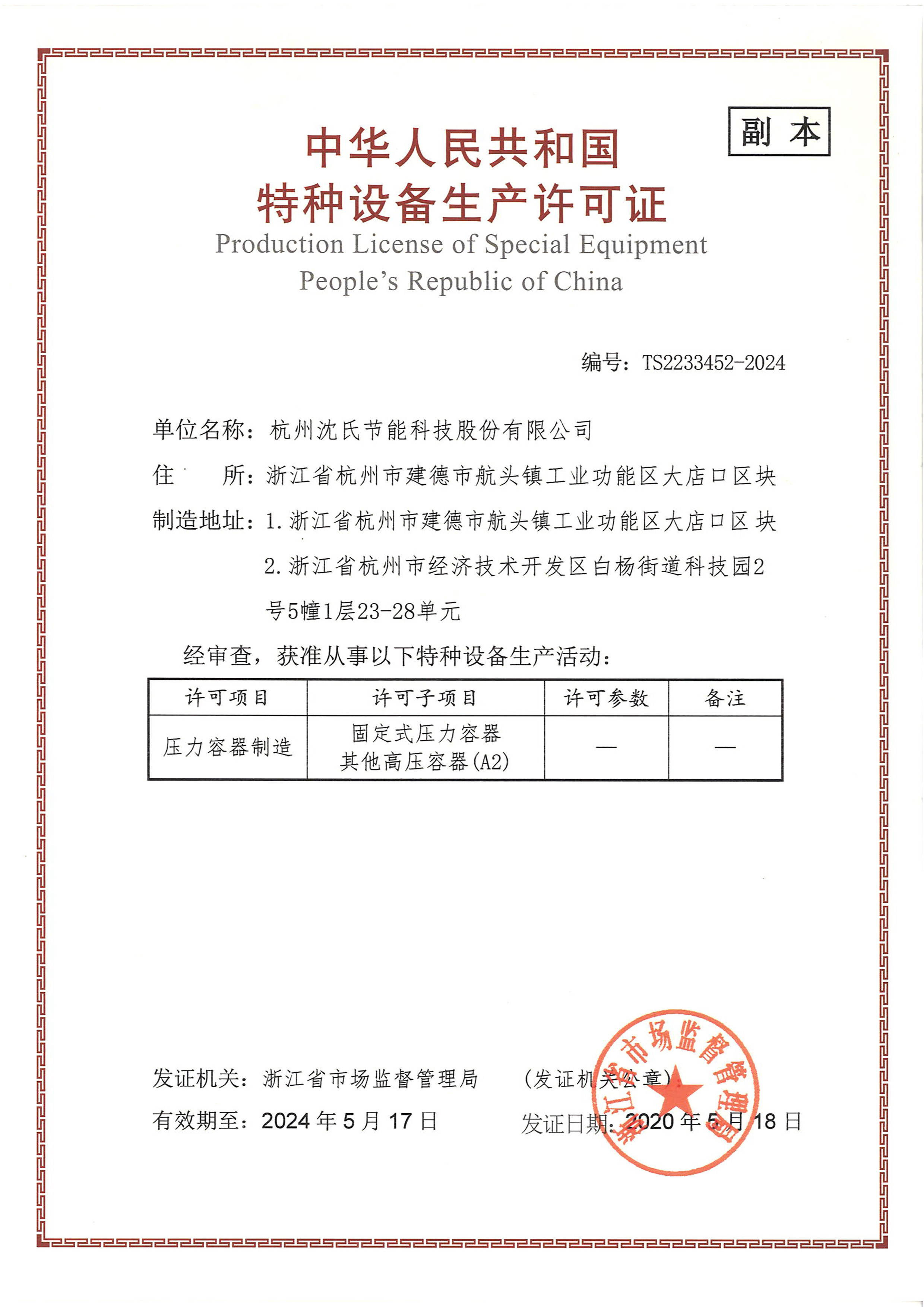 This license authorizes our company to manufacture fixed pressure vessels and other high-pressure containers (A2 category).