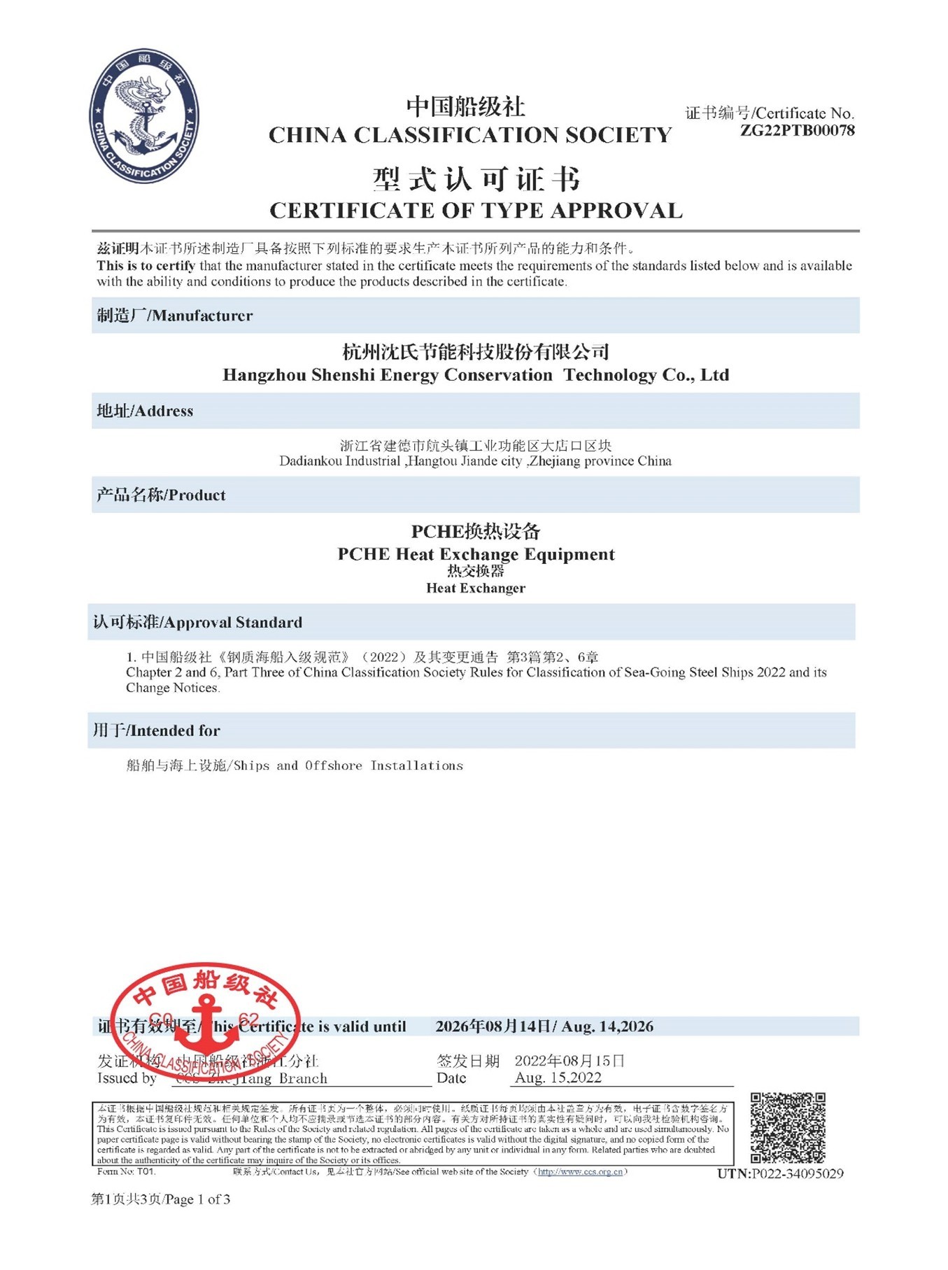 Hangzhou Shenshi Energy Conservation Technology Co., Ltd. holds the Certificate of Type Approval issued by the China Classification Society (CCS).