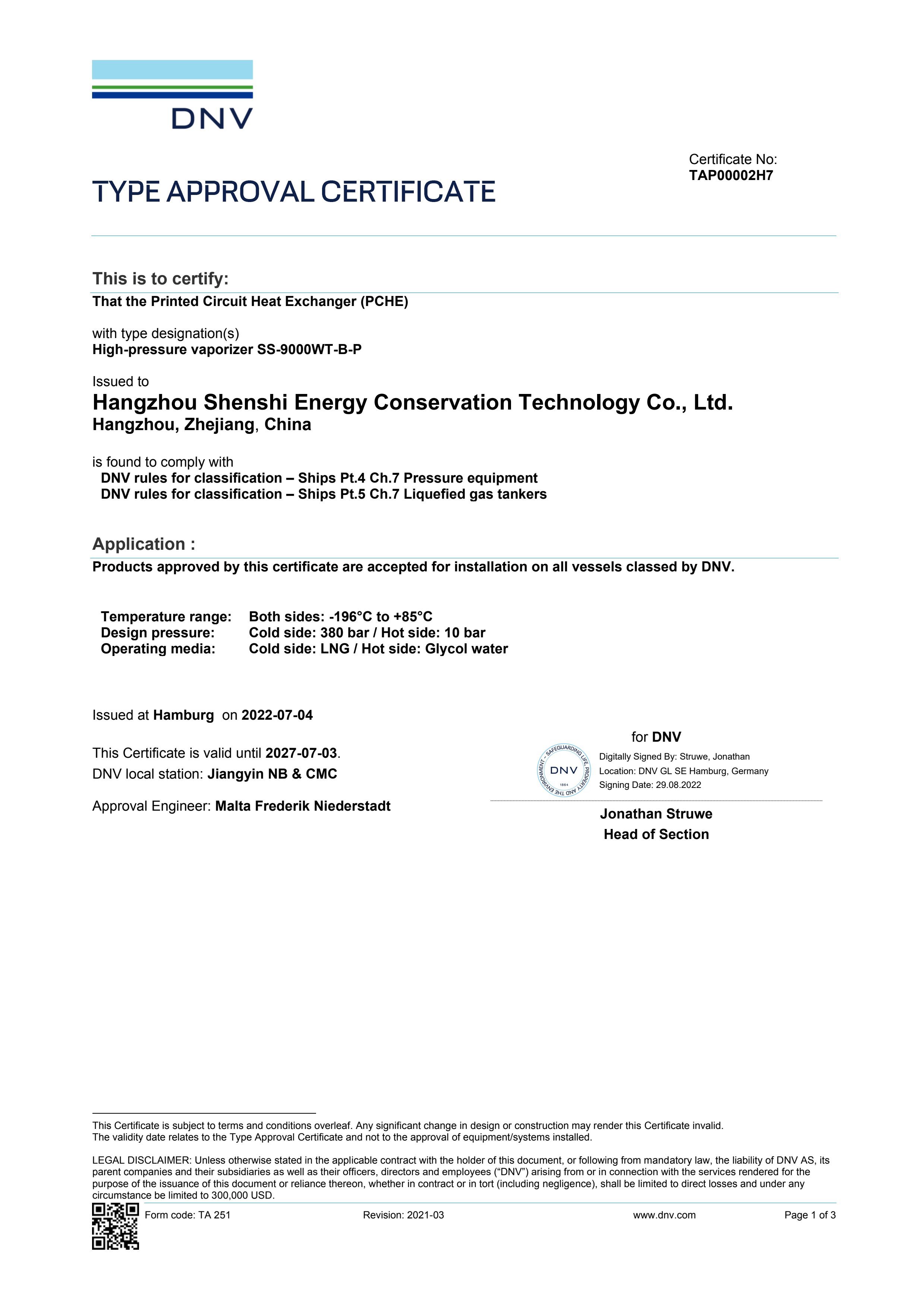 Hangzhou Shenshi Energy Conservation Technology Co., Ltd. holds the Type Approval Certificate issued by DNV, confirming that our Printed Circuit Heat Exchanger (PCHE) with type designation High-pressure vaporizer SS-9000WT-B-P complies with:
